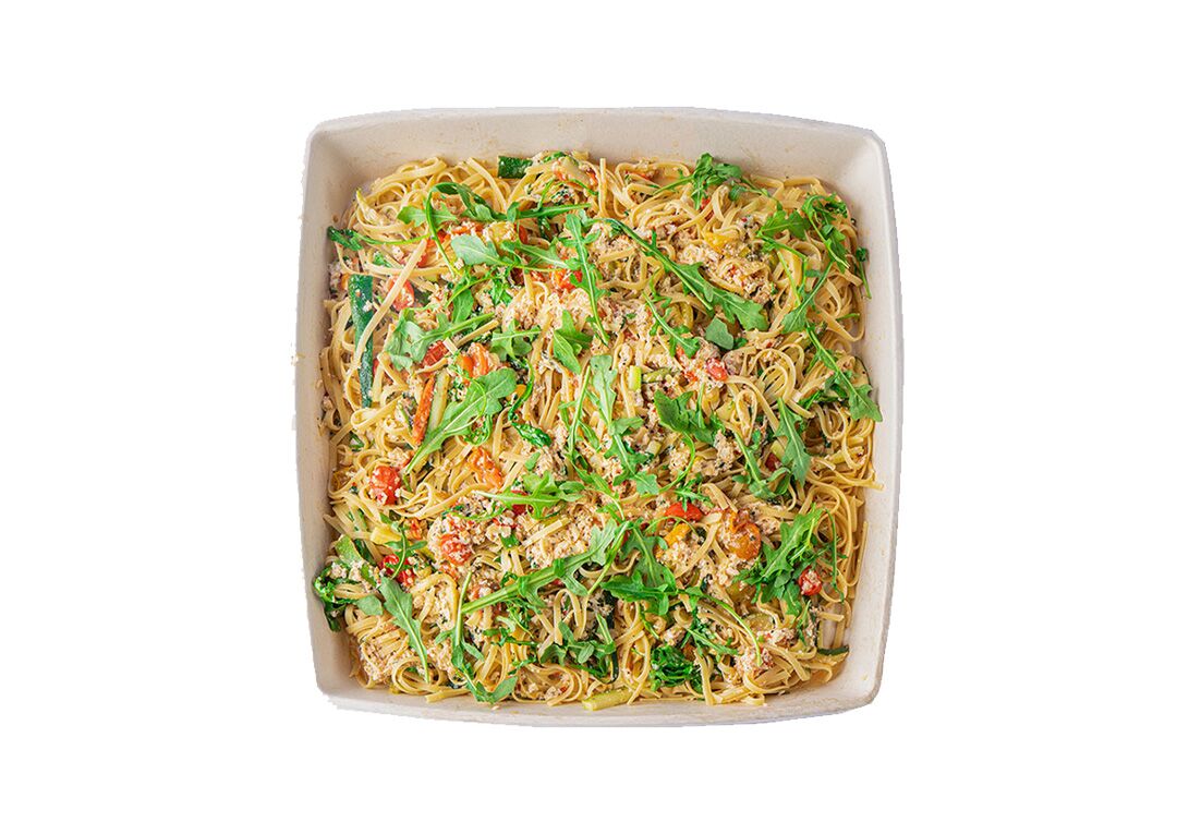 Linguine tossed with blue swimmer crab, zucchini, confit cherry tomatoes and rocket; drizzled with lemon, white wine and EVOO