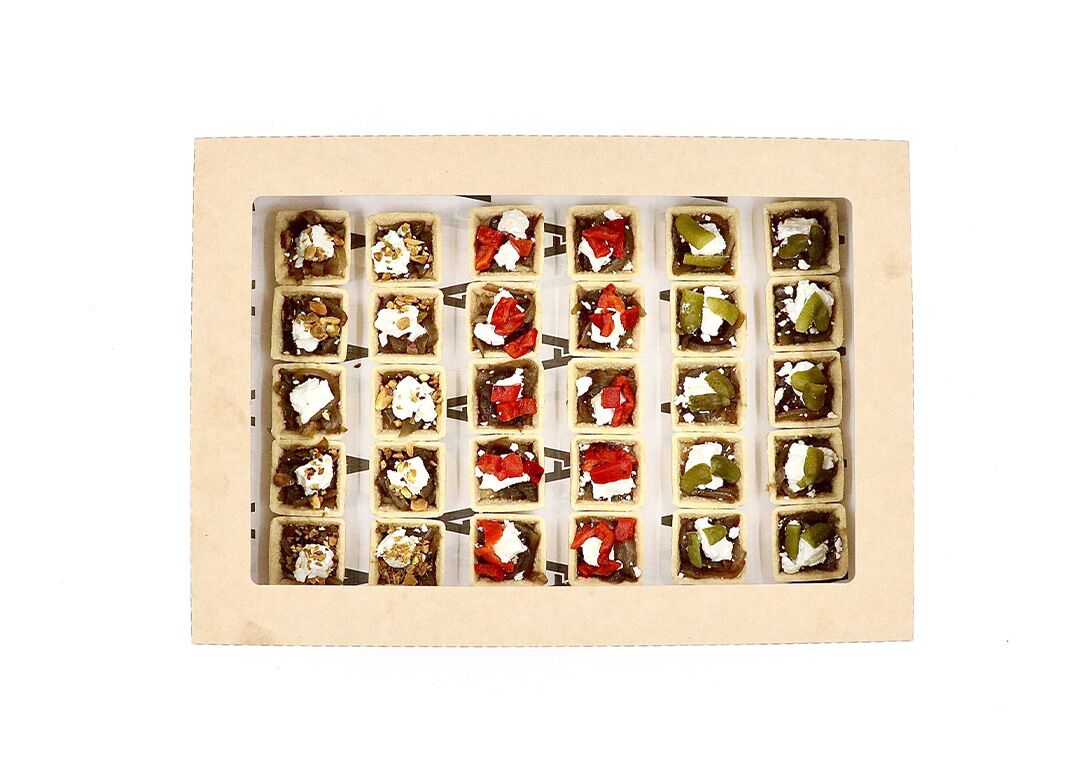 Goats cheese and caramelised onions tartelettes. Serves up to 10.