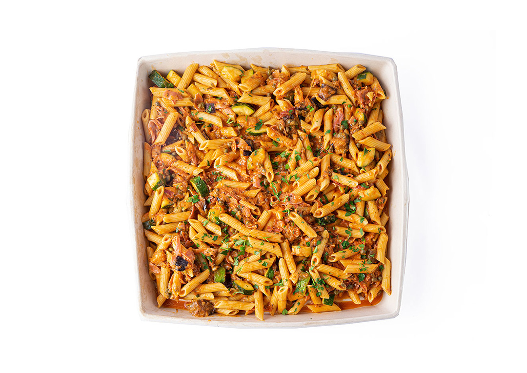 Penne served with prosciutto, capers, eggplant and zucchini; in a napolitana sauce